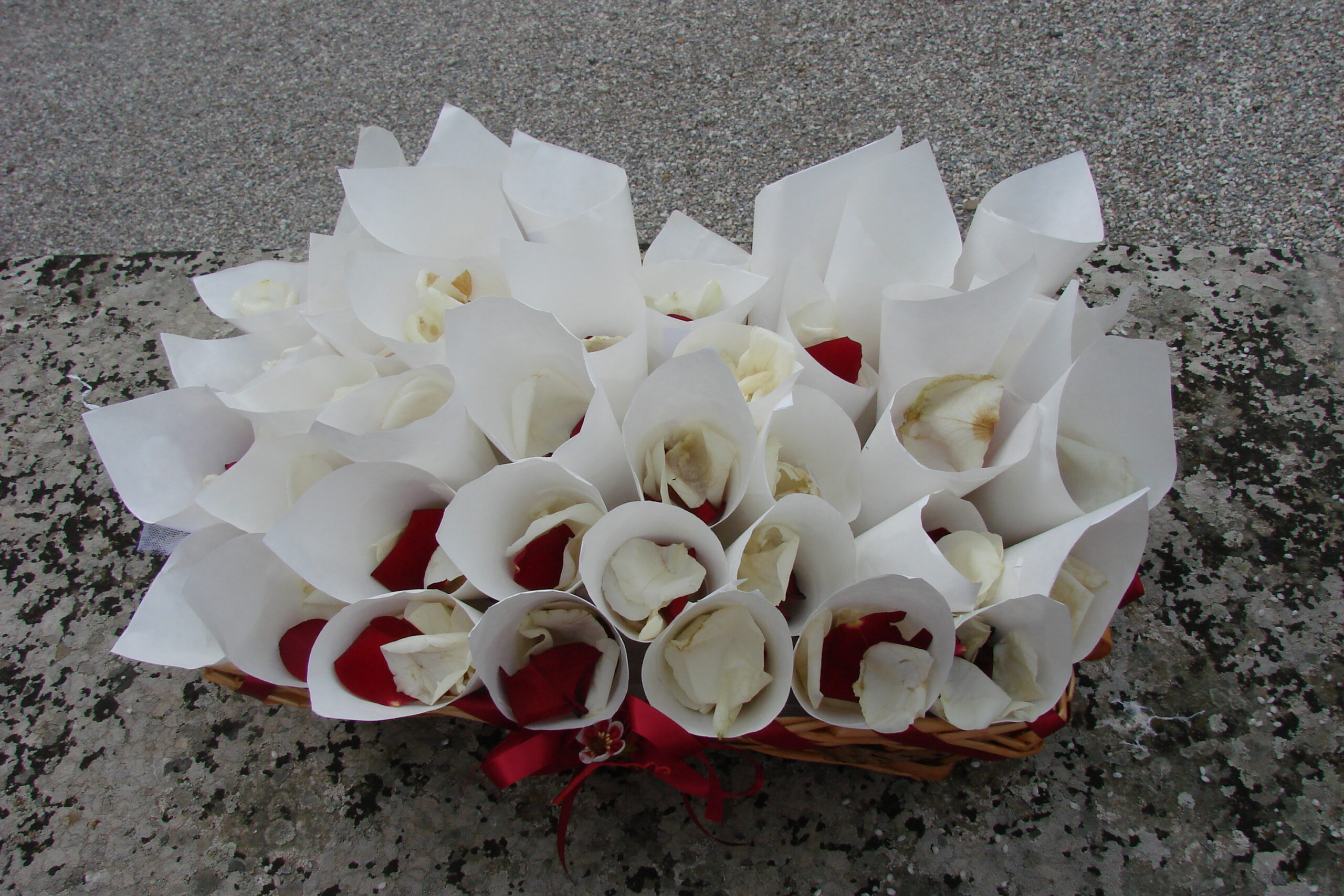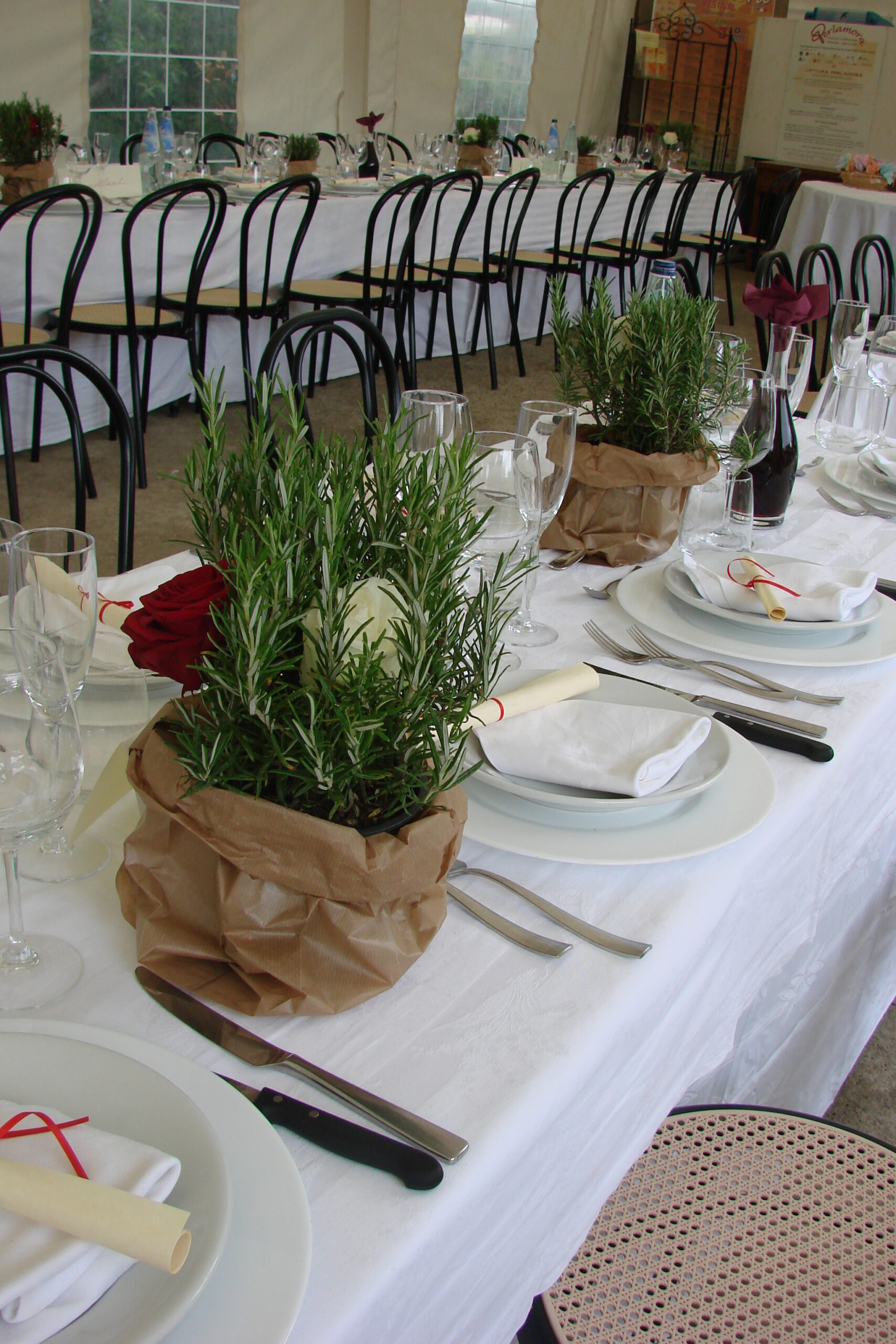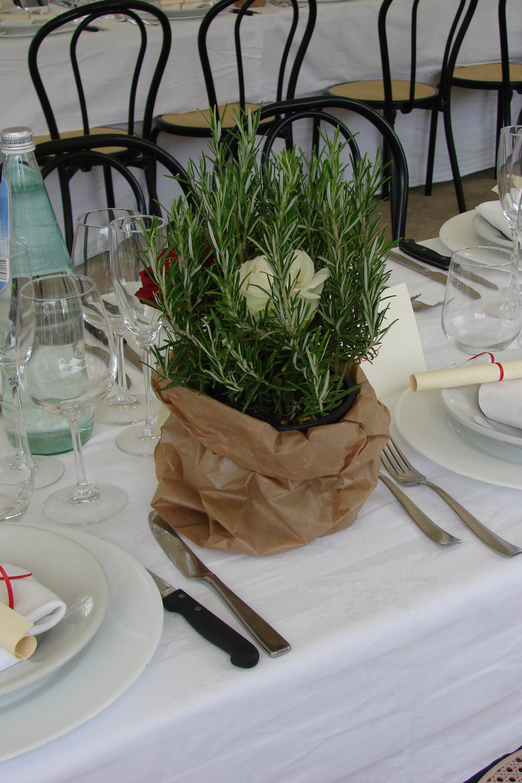 I organized the flowers at the reception tables with herbs such as rosemary, thyme, and peppermint, as well as a red and a white rose in the middle of the rosemary plant.